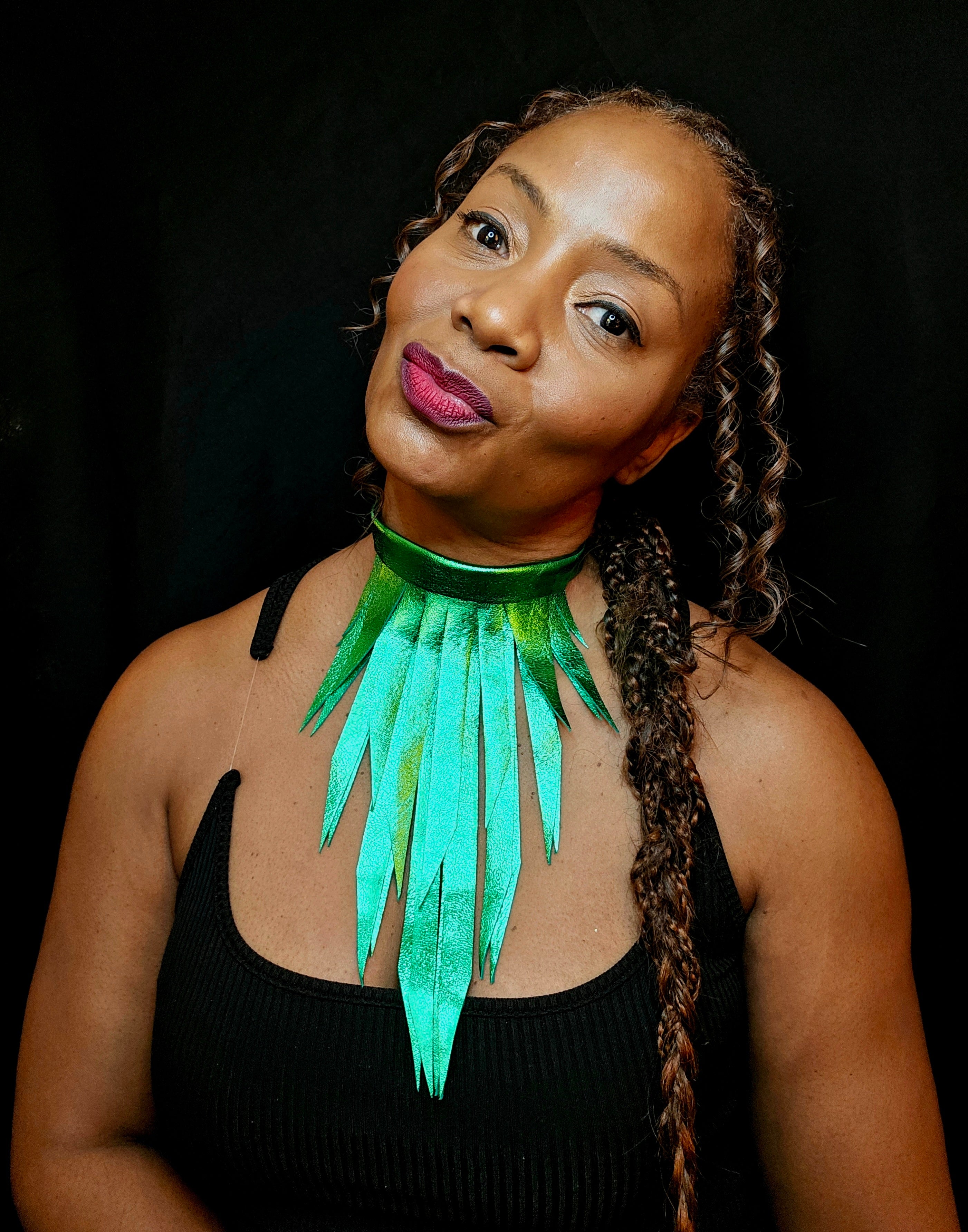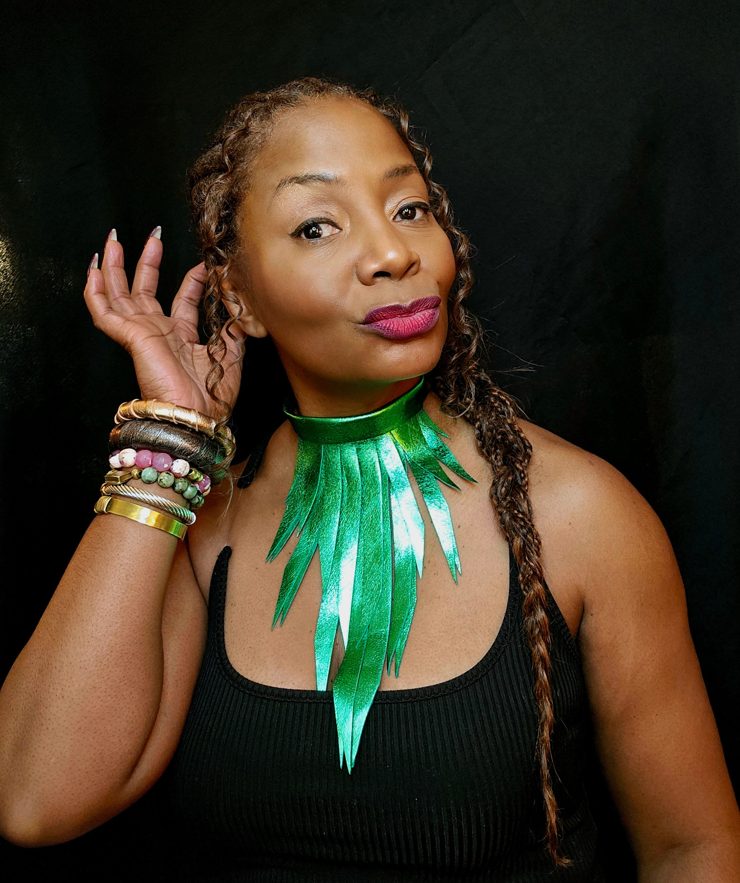 10 inches of luxurious deep green metallic cowhide leather. SHE IS DRAMA! This fringe choker sparkles, snaps, pops, shines and adds an instant pop of 'Yes, Ma'am' to every outfit!! Closure is standard metal.