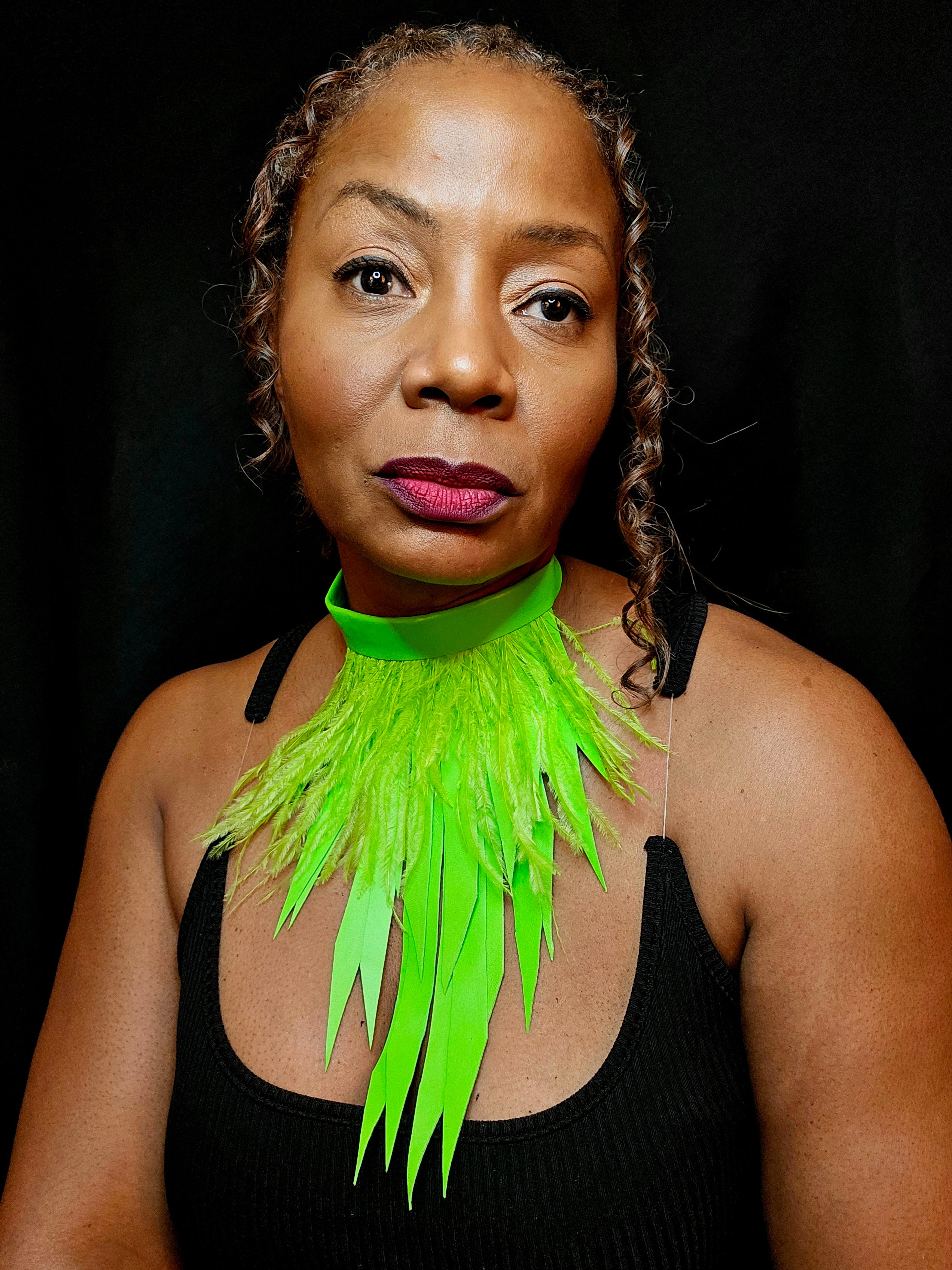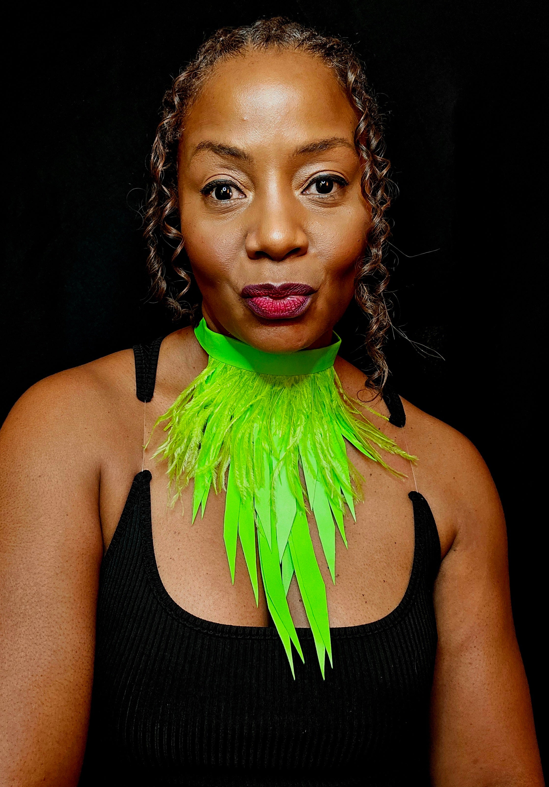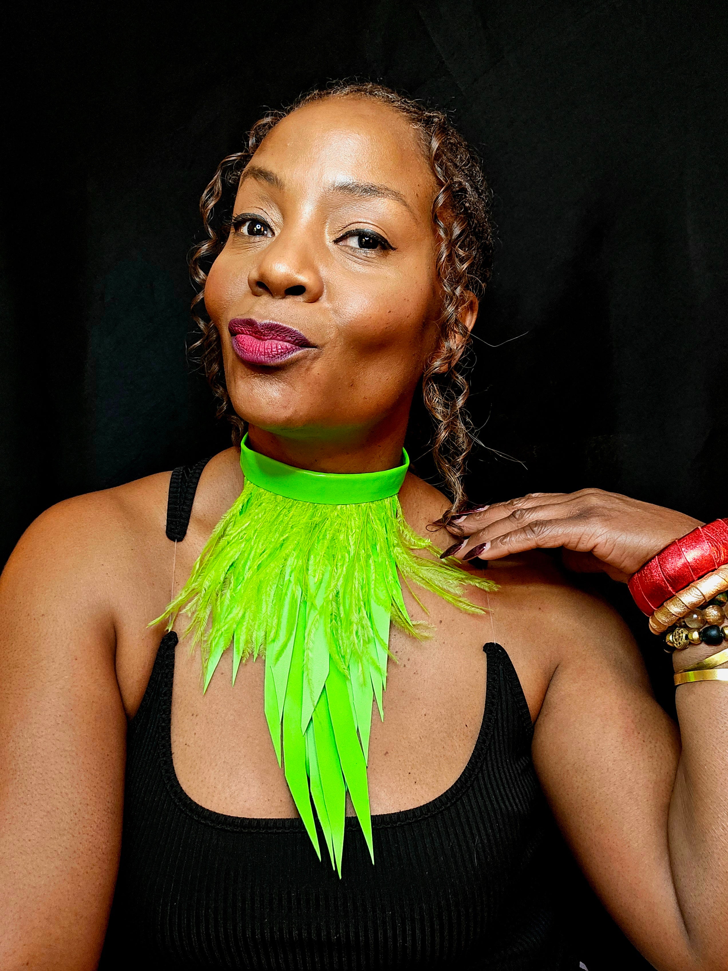 9 inches of luxurious and bright neon green leather choker necklace featuring SUPER soft ostrich feathers! SHE IS DRAMA! This fringe choker snaps, crackles and adds an instant pop of 'Yes, Ma'am' to every outfit!! Closure is standard metal.